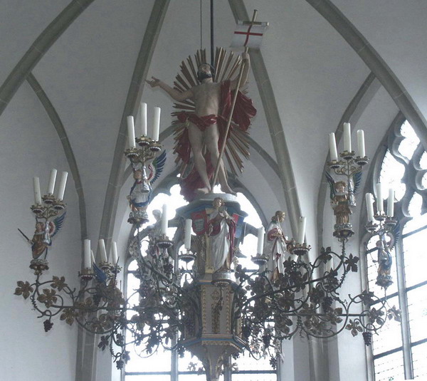 Ein letzter Blick nach rechts gilt der Gestaltung des rechten Seitenchores. Die große Lichtkrone konnte 1994 infolge ruinöser Kriegseinwirkungen - so restauriert werden (Herrn Hannes Heesen), dass man einen Gesamteindruck des ursprünglichen Zustandes erhält. Der eiserne Leuchter von 1904 steht in der Tradition der spätgotischen Lichtspender des 15. und 16. Jahrhunderts, d.h. einer Laterne in der Mitte, von der 6 mit Trauben und Blattwerk geschmückte Arme ausgehen. Sie münden in aus Holz gearbeitete Engelstatuen, die neben den Leidenswerkzeugen Christi, je einen Kerzenkandelaber tragen. Zwischen den Leuchterarmen sind je 6 weibliche Gestalten des Alten Testaments eingestellt, die für das Volk Israel von enscheidender Bedeutung waren:
